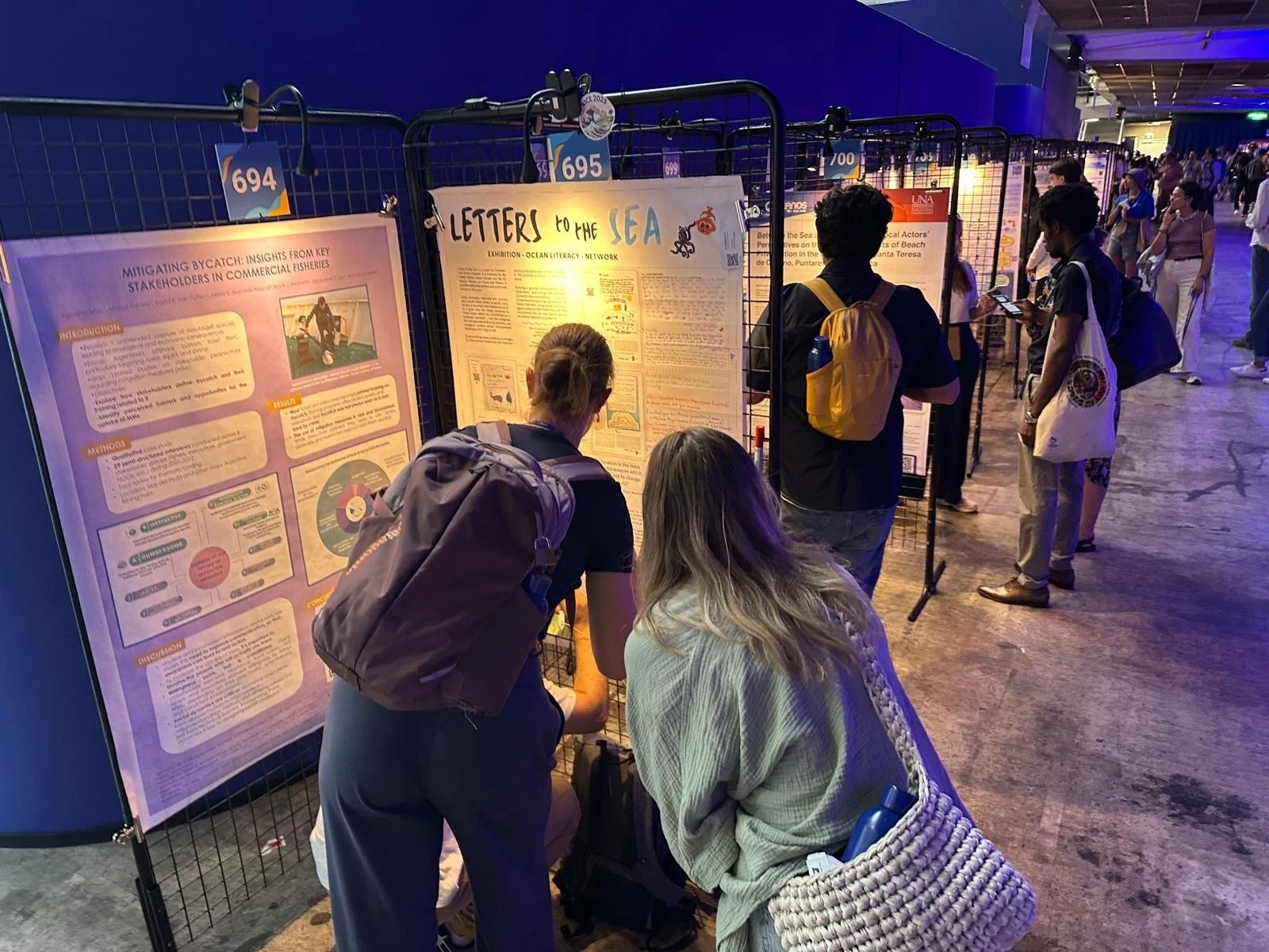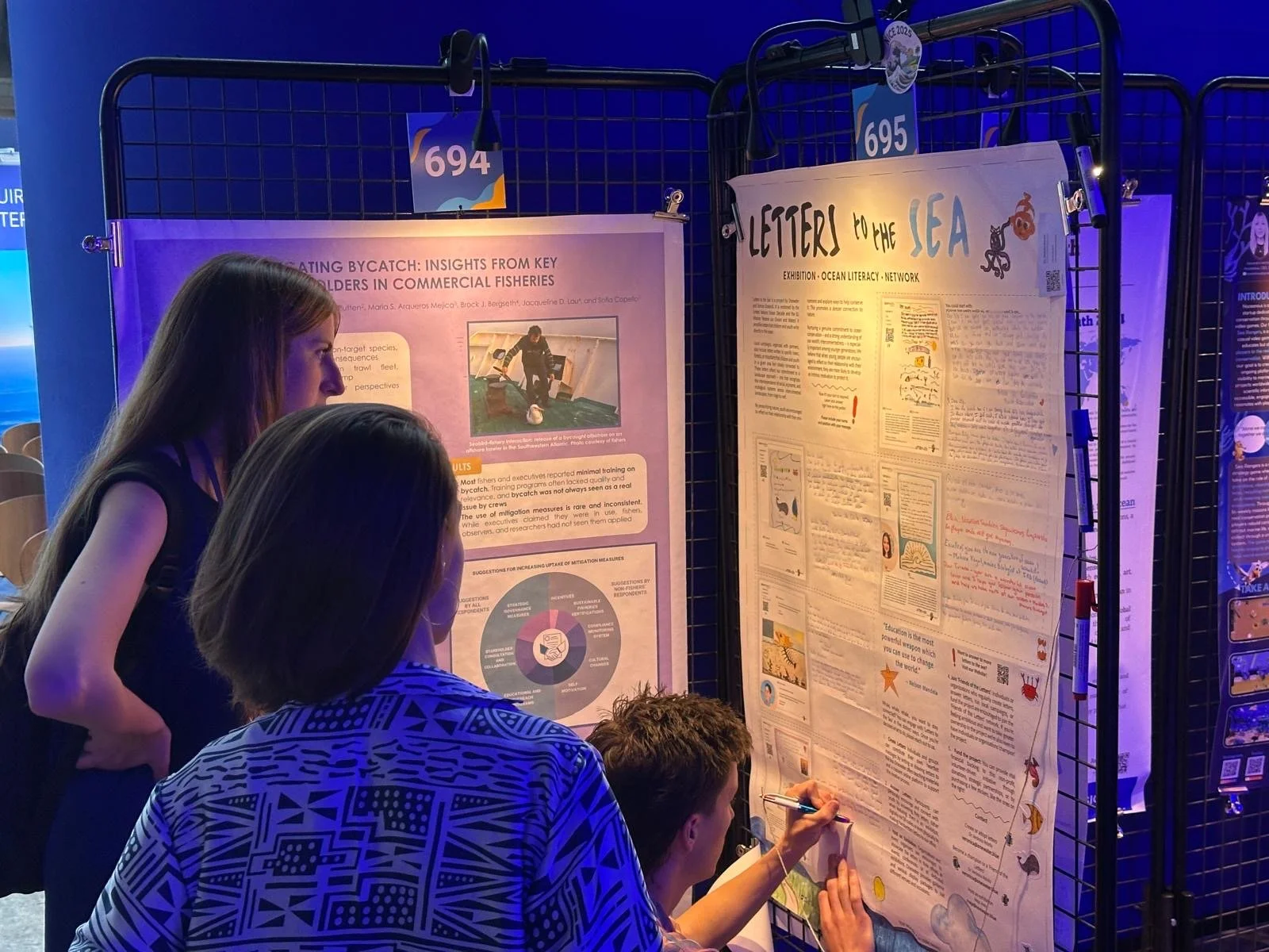 Was ich an diesem Projekt besonders berührend finde: Die Briefe werden auf internationalen Konferenzen präsentiert, bei denen Ozeanführer:innen die Möglichkeit haben, diese Briefe zu lesen, anzunehmen und darauf zu antworten. So entsteht ein echter Dialog zwischen den Generationen – ein Gespräch, das oft viel zu selten stattfindet. Mein Plakat zeigte eine Auswahl dieser Briefe und lud die Besucher:innen der Konferenz dazu ein, ebenfalls zu antworten. Es war beeindruckend zu sehen, wie daraus ein stiller, aber kraftvoller Austausch entstand. Gestaltung wurde hier zur Brücke, zur Verbindung zwischen Menschen, Generationen und Anliegen.